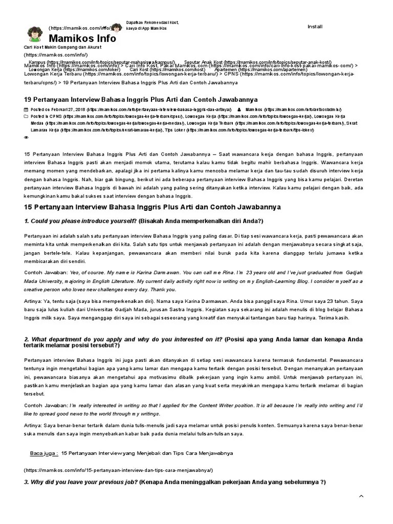 32+ contoh soal bahasa inggris interview. Disertai dengan contoh dalam berbagai bidang keahlian lengkap dengan tips dan trik membuatnya. Sebelumnya kita sudah belajar contoh soal personal letter sekarang ini adalah contoh soal job application letter dan jawabannya.materi personal letter biasanya diberikan untuk anak sma dan ma sementara soal surat lamaran kerja umumnya diberikan kepada siswa dan siswi smk. Melanjutkan tulisan contoh soal penjas kelas x semester 2 beserta jawabannya k13 pg bagian ke 8 soal nomor 106 120 pilihan ganda bagian kesembilan berisikan materi yang berbeda dengan sebelumnya yaitu tentang narkoba dan untuk pg bagian ke 9 soal dimulai dari nomor 121. Kupdf com 24 contoh jawaban pertanyaan tes wawancara kerja pdf 10 jawaban jitu saat interview kerja akuntansionline 7 pertanyaan penting di dalam wawancara untuk auditor dan akuntan contoh pertanyaan wawancara kerja beserta jawabannya doc bagi anda yang akan melakukan wawancara agie nugraha.
